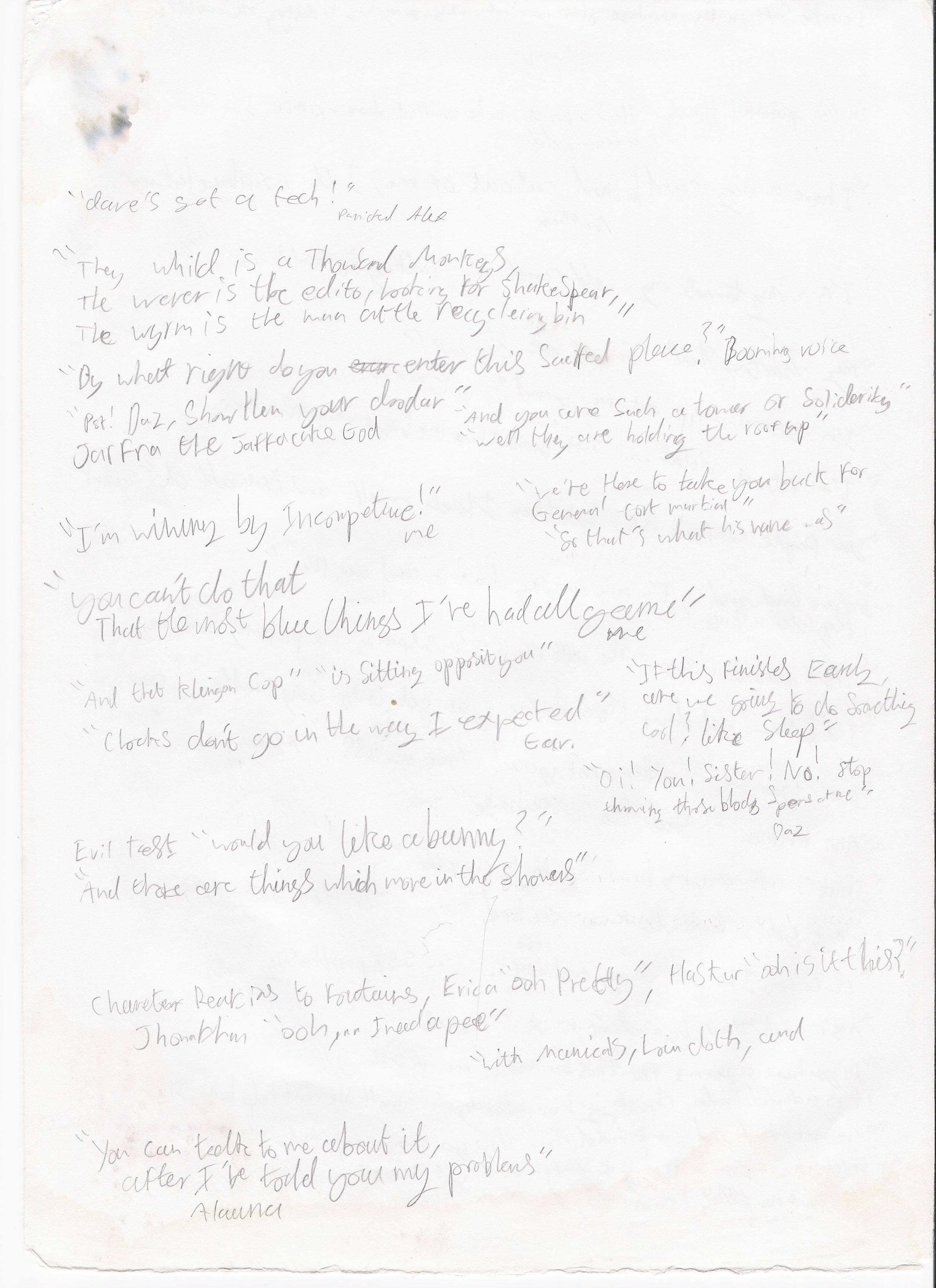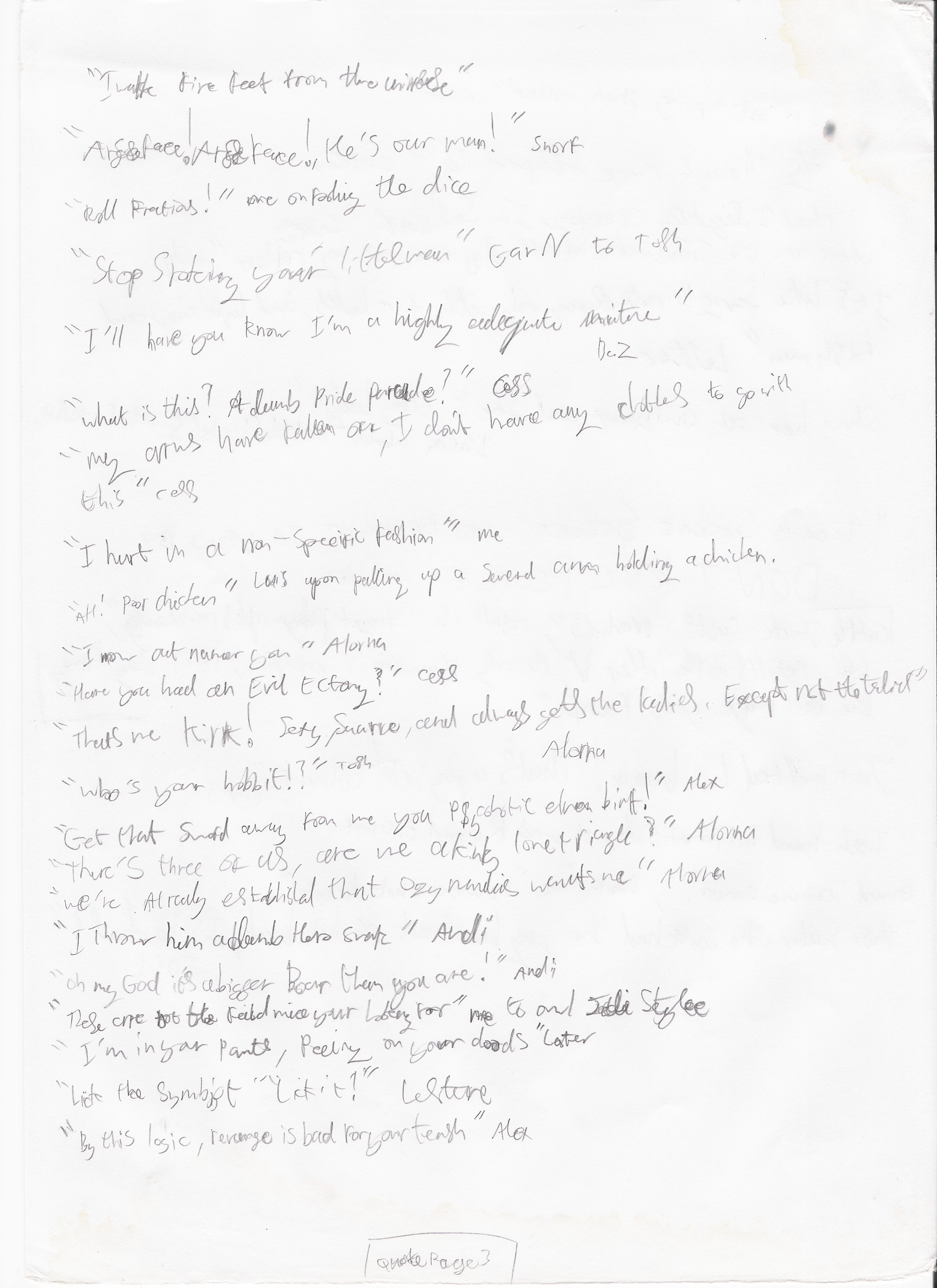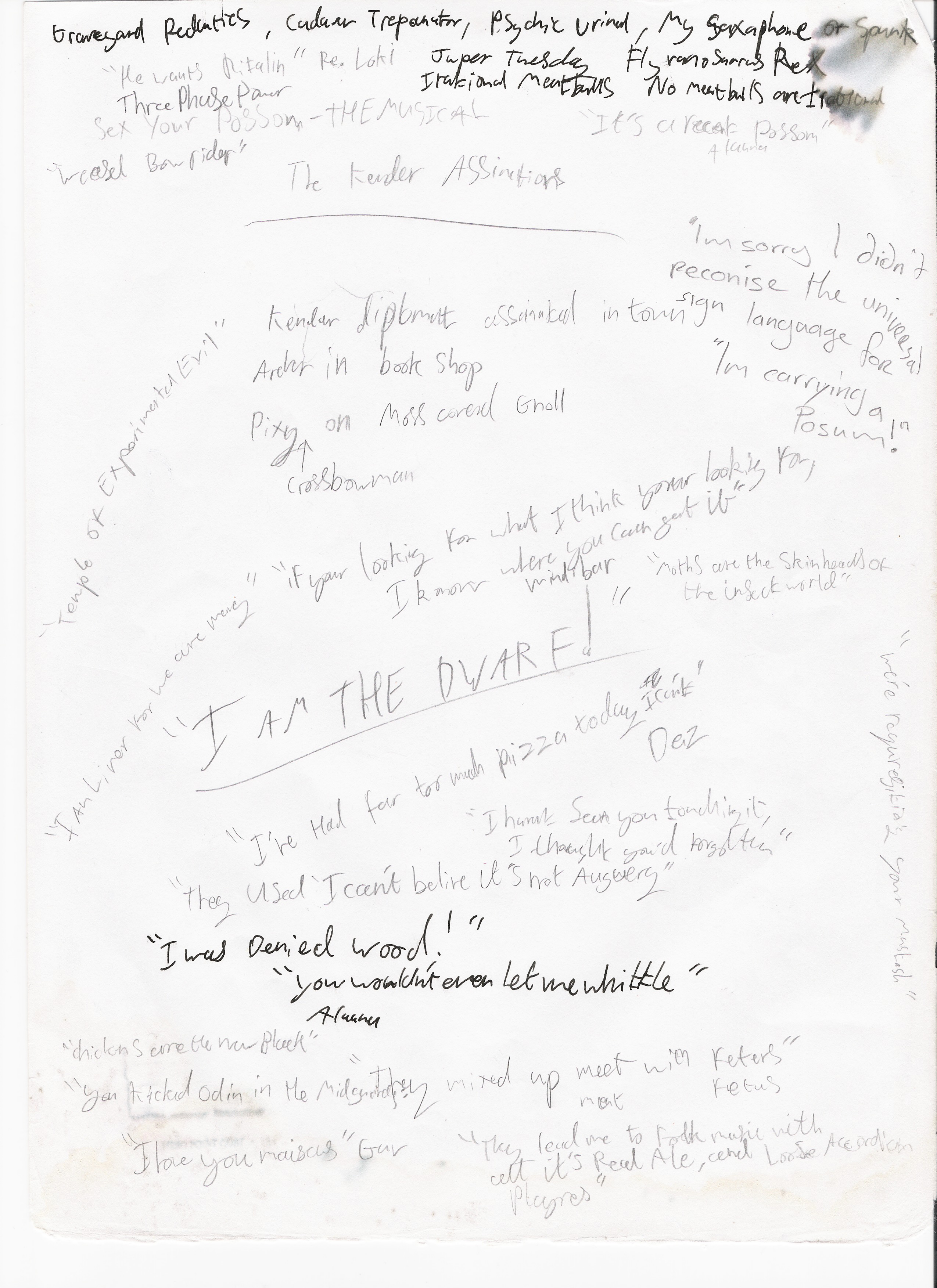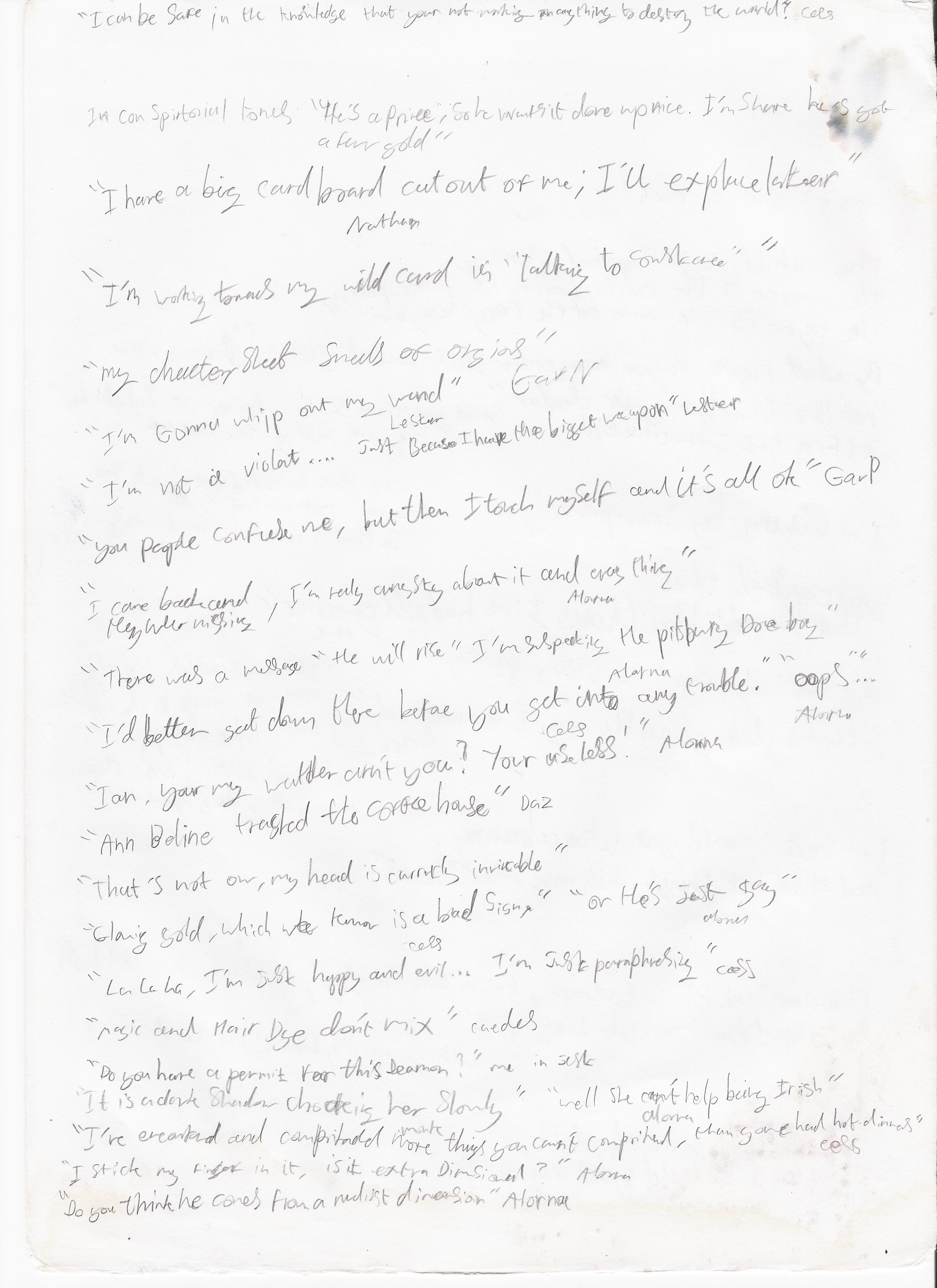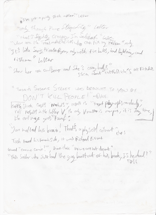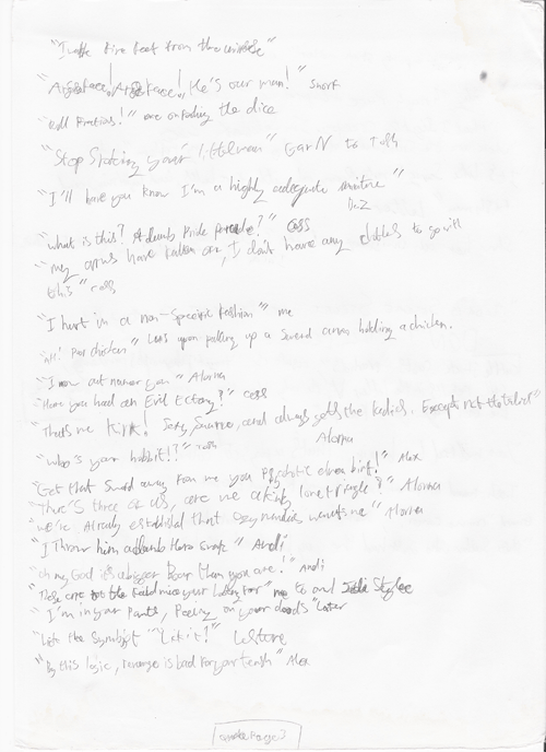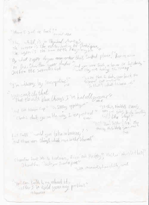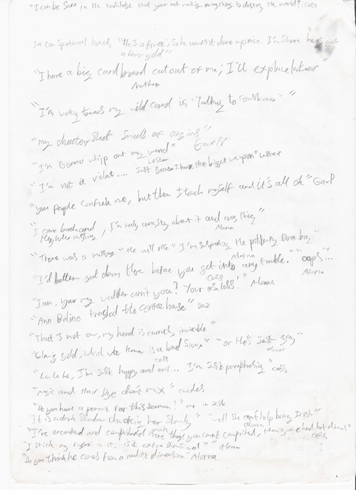 In the not too distant future this page will be a complete transcript of noteworthy, or particularly amusing utterances. At the present moment however it will simply be an archive of the sheets themselves, scanned.